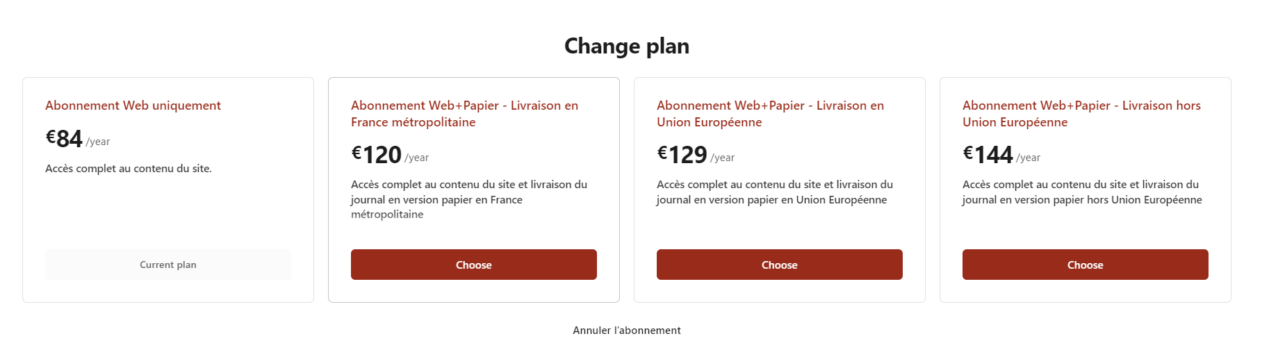 Pour changer de formule (passer de la fomule Web à Web+Papier ou inversement), il vous suffit de vous rendre dans la section "Mon compte" ( Comment accéder à "Mon compte"? )
